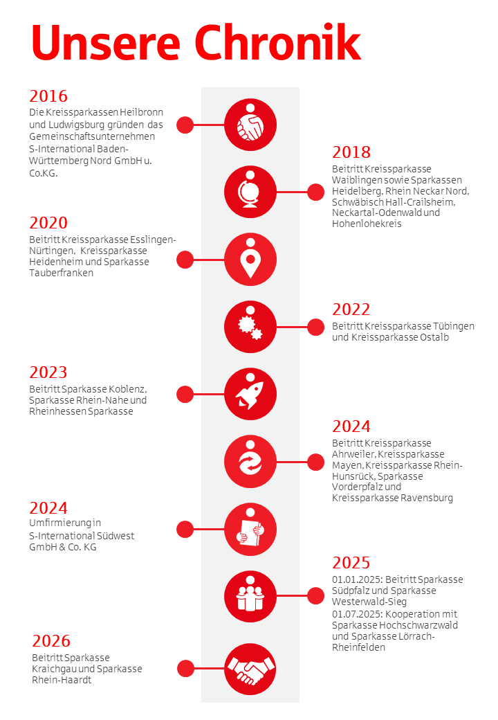 Aus einer gemeinsamen Idee wurde eine starke Partnerschaft: 2015 gründeten mehrere baden-württembergische Sparkassen die S-International Südwest GmbH & Co. KG, um ihre Kräfte im internationalen Bankgeschäft zu bündeln. Ziel war es, die Firmenkundinnen und -kunden der Sparkassen bei weltweiten Aktivitäten noch gezielter zu unterstützen.