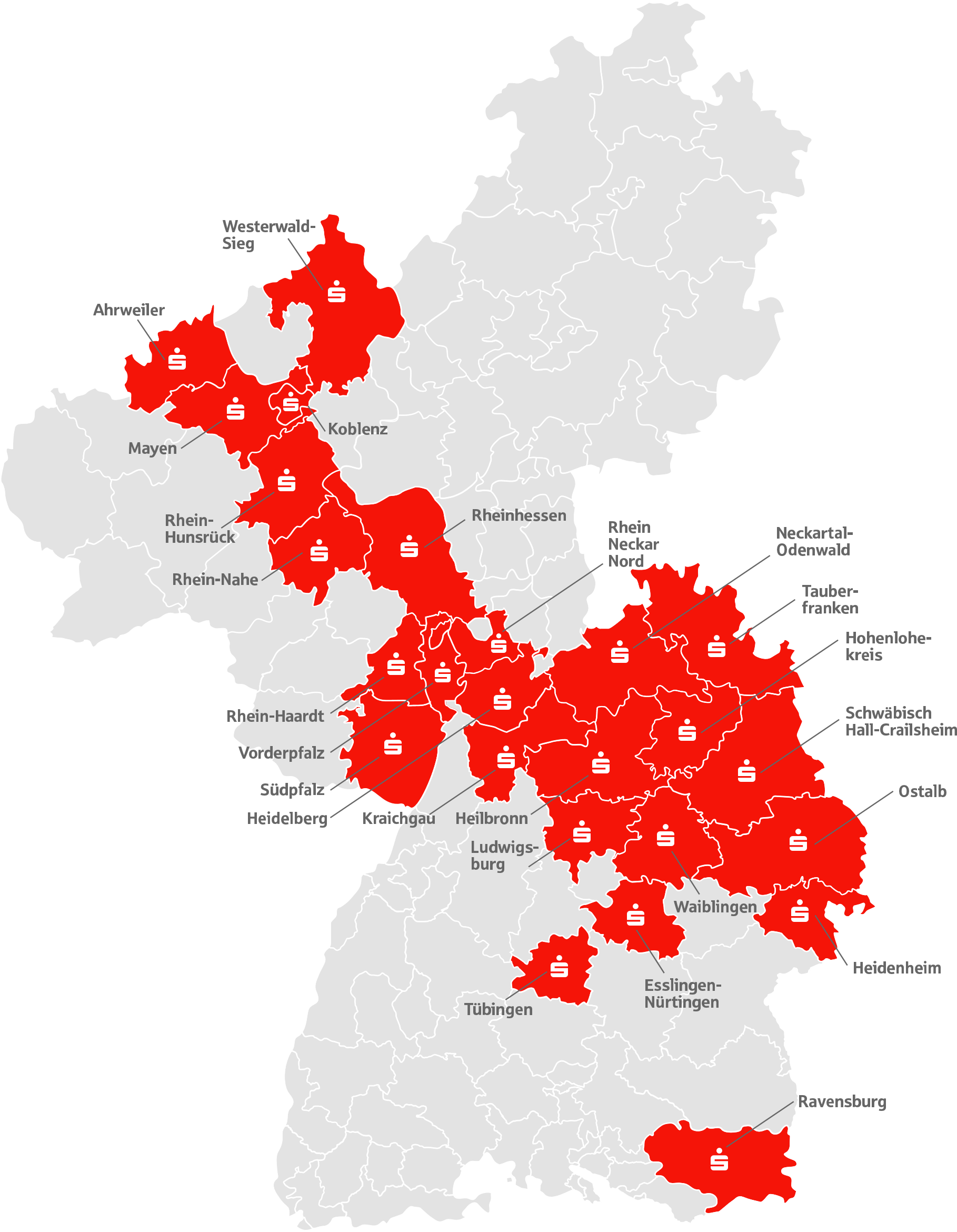 Hinter der S-International Südwest stehen 25 starke Kreissparkassen und Sparkassen verteilt auf unsere drei Marktbereiche.